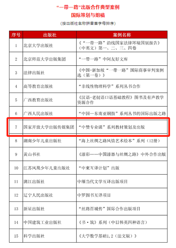 近日,中国出版协会“一带一路”出版工作委员会公布了第四届“一带一路”出版合作典型案例征集和国际化人才遴选结果,共有82个案例、10位国际化领军人才和23位国际化人才入选。由国家开放大学出版传媒集团申报的“中赞专业课”系列教材策划及出版(简称“中赞专业课”系列教材)入选“一带一路”出版合作典型案例(国际策划与组稿),这是出版传媒集团继“工业汉语”系列丛书后第二次获得该荣誉。