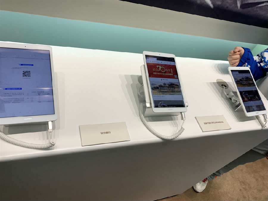成就展上的三台Pad也分外引人注目,分别展示了学分银行和五分钟课程,观众们可以通过三台设备进行交互体验。