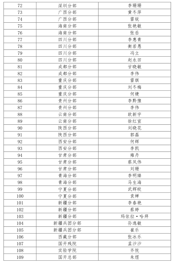 根据《关于开展国家开放大学首届优秀青年教师选拔及培养工作的通知》(国开教师〔2018〕4号)要求,经单位推荐、工作组审核、专家函评、专家组终审、公示等环节,总部认定天津分部王改芝等115名教师(具体名单见附件)为“国家开放大学首届优秀青年教师”候选人进行培养。