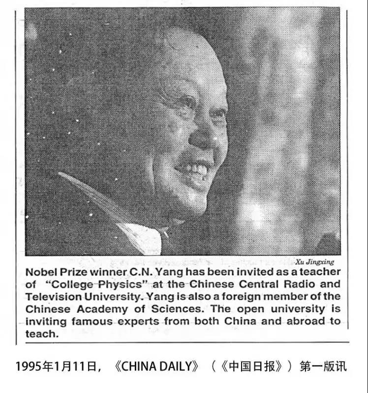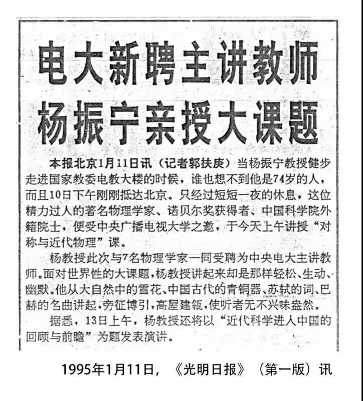 1995年1月11日上午,受聘担任电大主讲教师的杨振宁教授专程从纽约赶来,在国家教委电教大楼,发表了题为《对称与近代物理》的演讲。杨教授从远古人类对雪花的观察讲起,又通过苏轼的回文诗、巴赫的小提琴二重奏及伊斯兰史建筑等人类的文化、科技成果,深入浅出地阐述了“对称与守恒定律的关系”这一20世纪物理学的中心思想。1月13日,杨教授又以《近代科学进入中国的回顾与前瞻》为题发表演讲,演讲文稿收入电大《大学物理》教材,演讲录像作为电大视听教材在全国播放。
