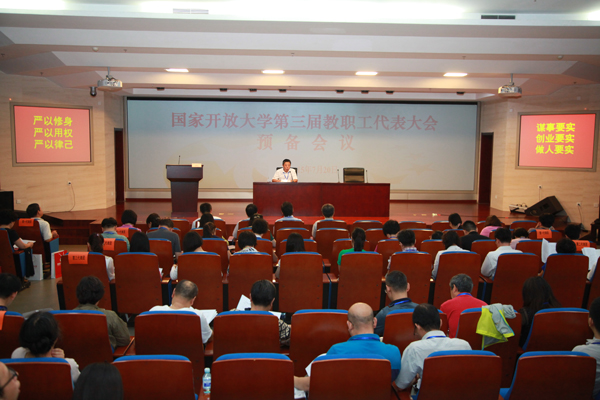 7月20日,国家开放大学召开第三届教职工代表大会预备会议。校长杨志坚、党委书记李凌、党委副书记张少刚、副校长刘臣出席会议。75名教职工代表(正式代表86人,缺席11人,实到75人)与会。会议由国家开放大学工会常务副主席王淑娟主持。
