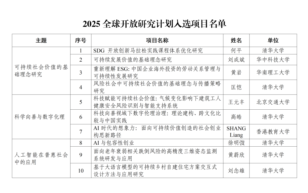 据清华大学可持续社会价值研究院介绍,2025年度“SSV开放计划”自7月面向全球开放征集,共收到174份有效课题申请,经国内外多学科专家组成的评审委员会严格评审,最终20项课题脱颖而出。入选项目展现出新兴技术、人文社会科学与实践场景深度融合的鲜明特点,强调回应全球可持续发展中的现实挑战。