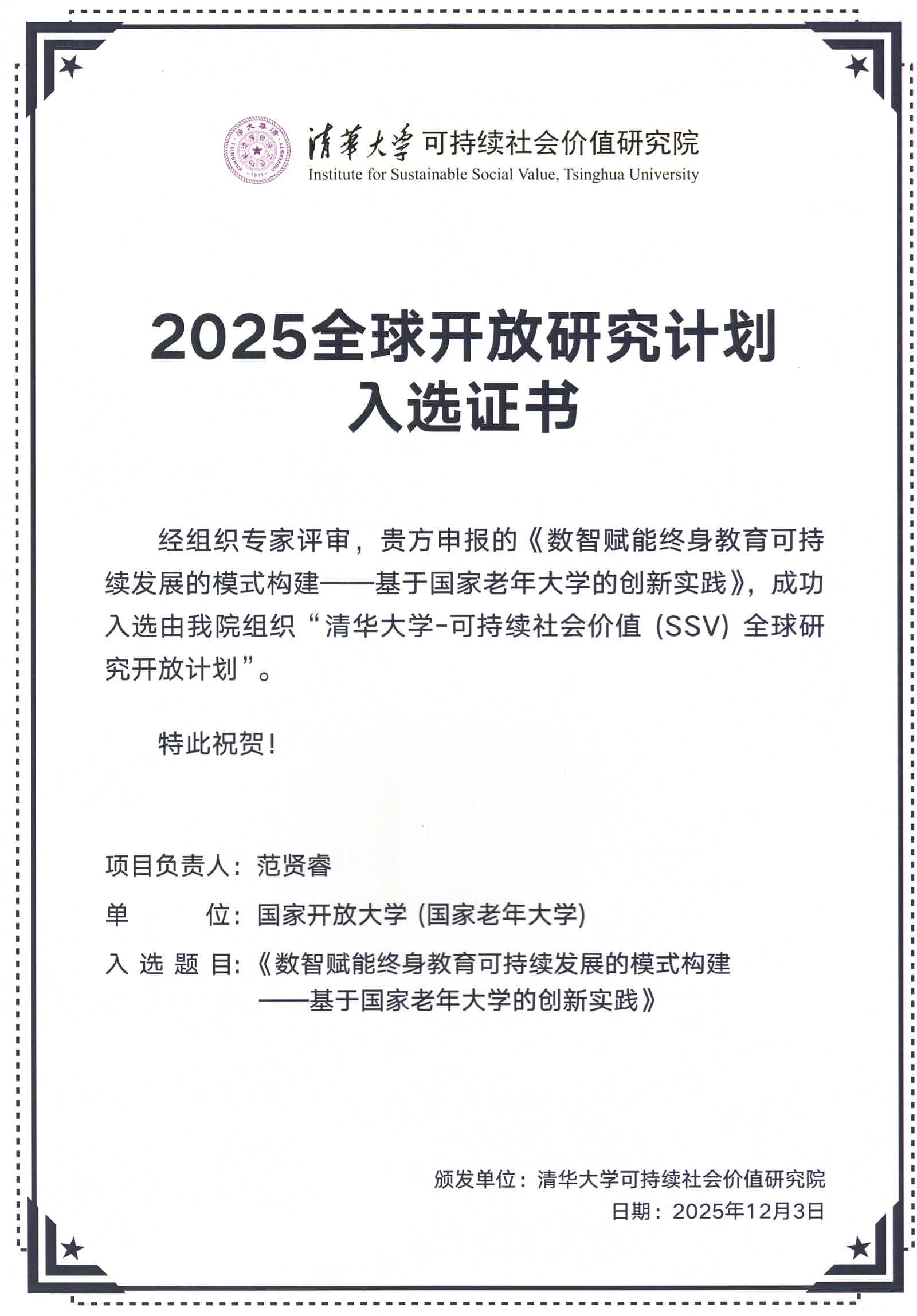 近日,在2025可持续社会价值创新大会上,清华大学可持续社会价值研究院公布“可持续社会价值(Sustainable Social Value,SSV)全球开放研究计划”(以下简称“SSV开放计划”)2025年度入选项目名单,国家开放大学(国家老年大学)“数智赋能终身教育可持续发展的模式构建——基于国家老年大学的创新实践”课题成为首届入选项目之一。