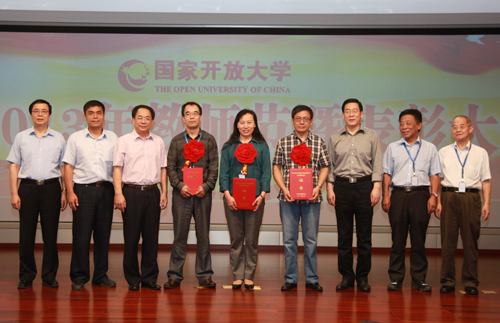 校领导为5个“2013年度国家开放大学精品课程”团队颁发荣誉证书。