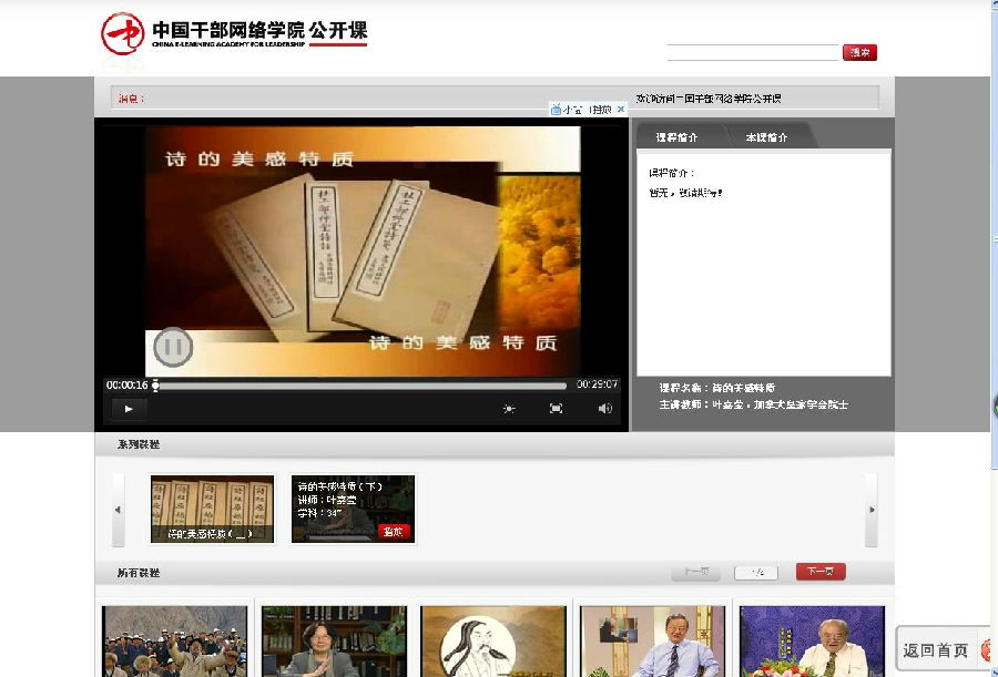 打开中国干部网络学院公开课的界面,这些优秀课程就会呈现在学习者面前:《词的美感特质》由叶嘉莹先生娓娓道来,《中国雕塑的艺术特征》被钱绍武先生赋予了丰富的情感,《〈红楼梦〉与中国文化》成为周汝昌先生的“千古绝唱”……
