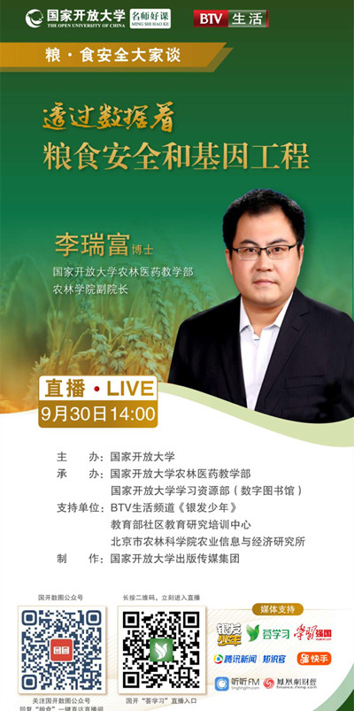 “粮•食安全大家谈”系列直播课是国家开放大学为响应习近平总书记“把保障粮食安全放在突出位置”“厉行节约,反对浪费”等重要指示,献礼我国第三个农民丰收节而特别推出的在线公开课。来自中国农业大学的教授专家朱俊峰、朱启臻、孔祥彬、沈群、罗云波,科信食品与营养信息交流中心研究馆员钟凯,以及国家开放大学农林医药教学部博士李瑞富,陆续就公众普遍关心的粮食和食品安全问题,结合各自研究领域和专长进行了讲解和分享。