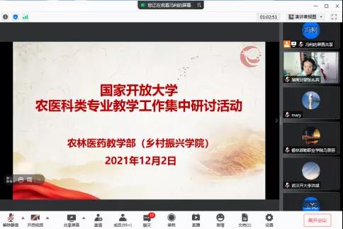 为进一步落实国家开放大学学历教育“创优提质”战略,促进学科、专业发展,提升教育教学质量,国家开放大学农林医药教学部(乡村振兴学院)于2021年12月2日通过线上线下相结合的方式开展了农医科类专业教学工作集中研讨活动。活动主要围绕农医科类专业建设与发展、“金课”建设、课程思政、网络教学团队建设与运行以及农医科类教学研究等开展。