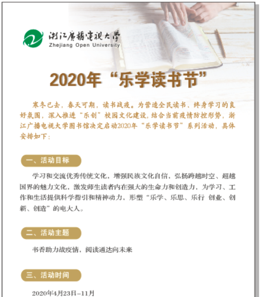 浙江分部积极组织“乐学读书节”活动,推出“乐学讲坛系列讲座”,以云教室为平台,面向全校师生、老年学员以及社会观众进行直播。据了解,浙江分部将与浙江图书馆合作设立“乐学讲坛•文澜讲坛”,以“生命健康”为主题,邀请知名专家,开展线上线下系列讲座。随后,他们还将开展系列读书沙龙、主题图像创意作品征集、“读书达人”评选、图书荐购等系列活动,营造全民读书、终身学习的良好氛围。