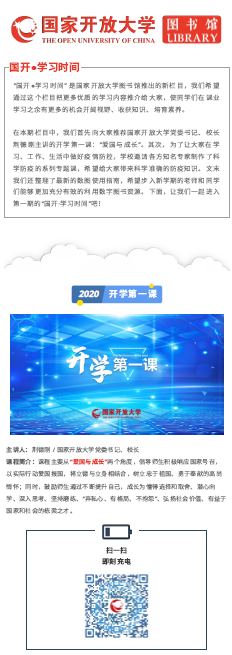 同时,国家开放大学总部图书馆推出“国开•学习时间”栏目,通过发现、组织、推送、宣传更多优质的学习资源,使国开学子在课余之时有更多机会开阔视野、收获知识、培育素养,成为工作和学习中的第二课堂。