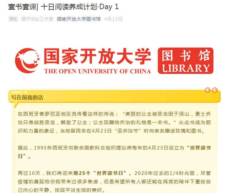 提倡阅读增进学子内涵气质,“擦亮国家开放大学的牌子”。在第25个世界读书日到来之时,国家开放大学党委书记、校长荆德刚寄语同学们《以阅读暖人心以书香战疫情》,提倡用互联网阅读方式,常读书,读懂书,让阅读成为国开学子长期坚持的一种生活习惯;爱读书,读好书,让书香成为国开学子自然流露的一种内在气质。