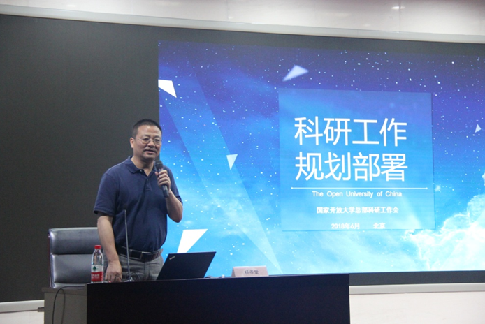 校长杨志坚在会上讲话。他指出,科学研究是大学的重要职能之一。当前国家开放大学建设已向纵深发展,从建设方案到1314工程,再到每个年度重点工作持之以恒的推进,既取得进步,同时也存在很多问题,只有紧紧围绕国家开放大学改革创新和发展深入推进相关研究,才能促进学校发展再上新台阶。杨志坚对科研工作提出3点要求:第一,要紧紧围绕教育教学问题开展科学研究,将教育教学问题作为科研工作的主攻方向和主要领域;第二,要用开放的模式去推进科研工作;第三,以问题和目标为导向,向纵深推进,所有研究都要体现阶段性成果,推进大学战略转型,实现战略目标。