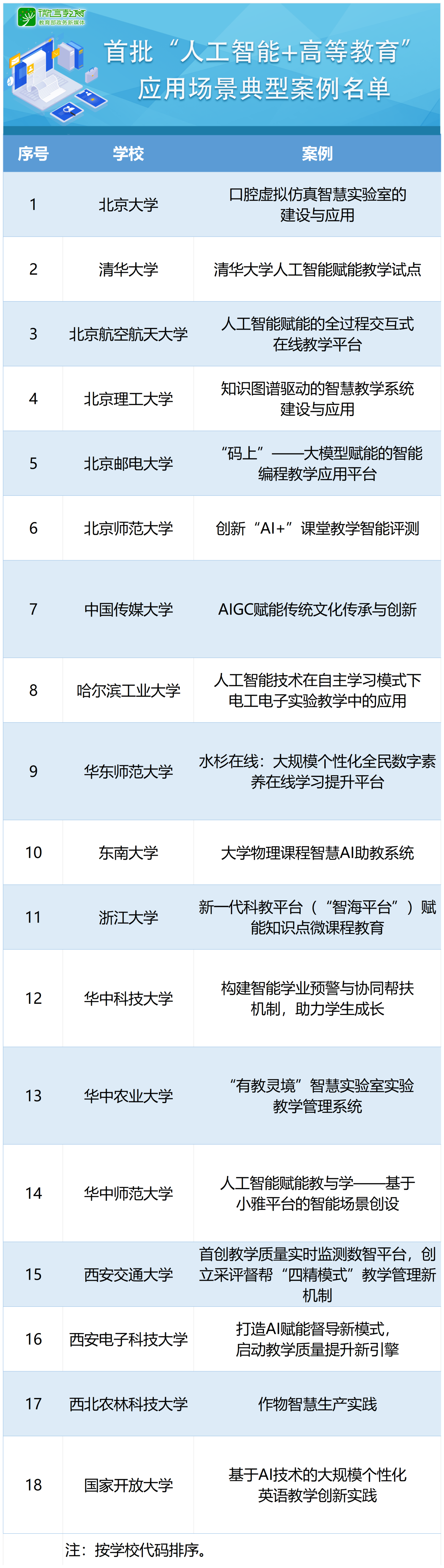 据悉,首批“人工智能+高等教育”应用场景典型案例经高校申报、专家论证等环节,最终确定。首批“人工智能+高等教育”典型应用场景案例的征集和论证工作,旨在深入贯彻落实国家关于开展“人工智能+”行动的战略部署,积极推动高等教育与人工智能技术的融合发展,利用智能技术支撑人才培养模式的创新、教学方法的改革、教育治理能力的提升,寻找、发掘和推广在人工智能技术应用上具有代表性、前瞻性且能够产生积极影响的高等教育实践案例。
