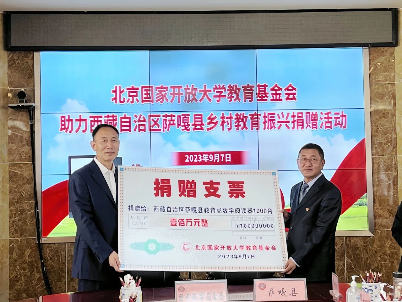 国家开放大学教育基金会秘书长郑洁与萨嘎县委副书记、县长次仁旺拉签署捐赠协议书。国家开放大学教育基金会理事长鞠传进向次仁旺拉赠送了捐赠支票,为萨嘎县教育局提供价值100万元的数字阅览器1000台,用于萨嘎县域内中小学电子阅览室建设,支持萨嘎县乡村教育振兴。教育部职业教育与成人教育司教学与质量处李宇辉,日喀则市委副书记、常务副市长来永见,西藏自治区教育厅职成处三级调研员马林共同见证。