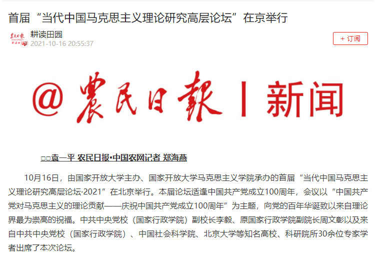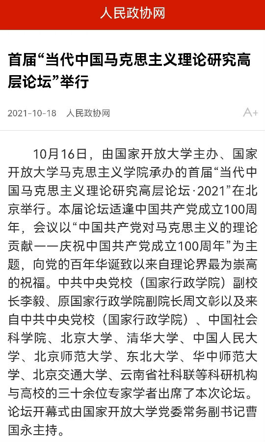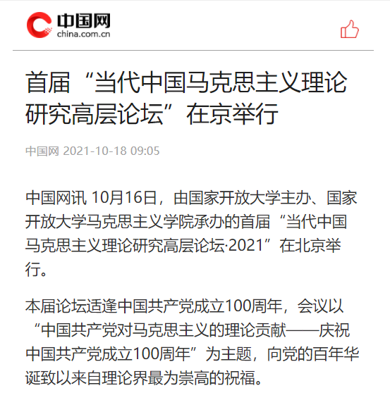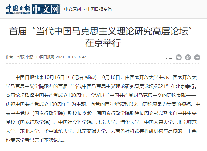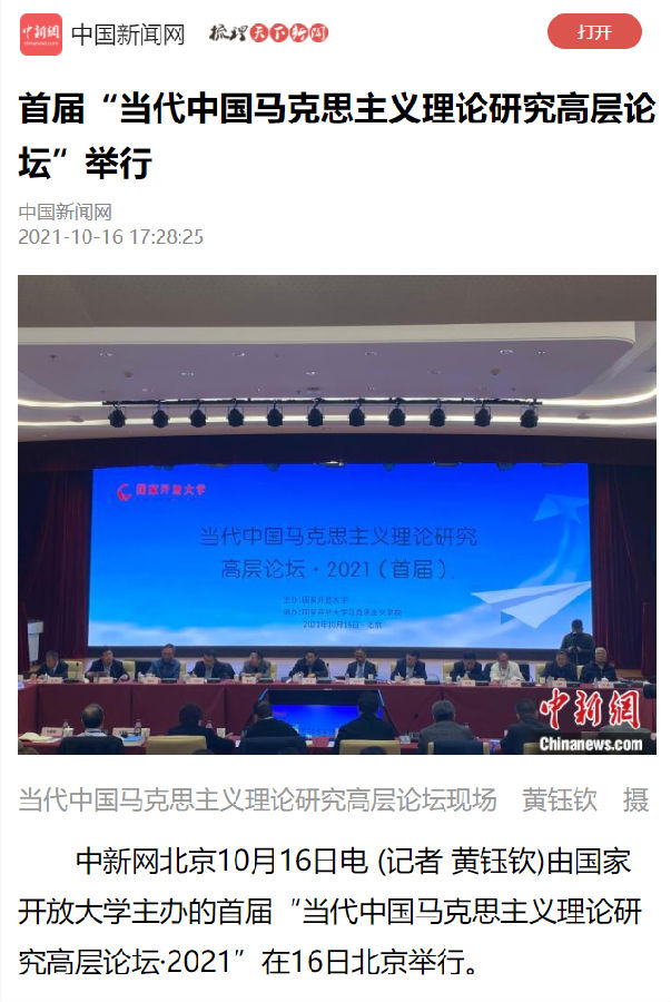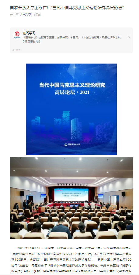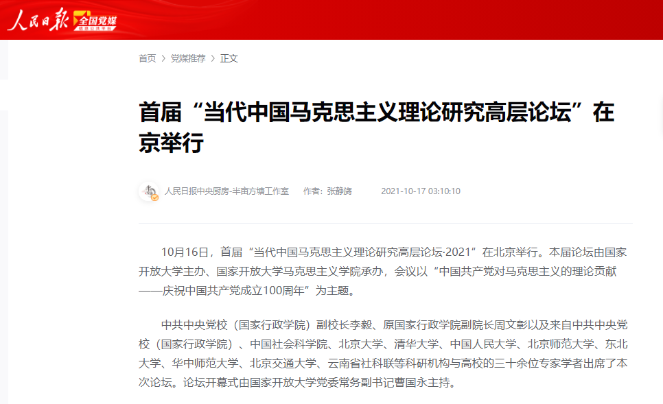 2021年10月16日,由国家开放大学主办、国家开放大学马克思主义学院承办的首届“当代中国马克思主义理论研究高层论坛·2021”在北京举行。会议的主题是“中国共产党对马克思主义的理论贡献——庆祝中国共产党成立100周年”。来自中共中央党校、中国社会科学院、北京大学、清华大学等科研机构与高校的三十余位专家学者参与会议。
