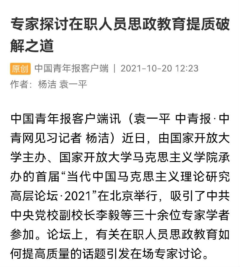 【中国青年报客户端】专家探讨在职人员思政教育提质破解之道