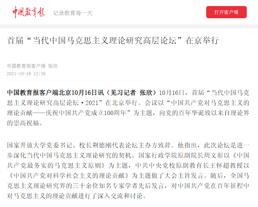 【中国教育报客户端】首届“当代中国马克思主义理论研究高层论坛”在京举行