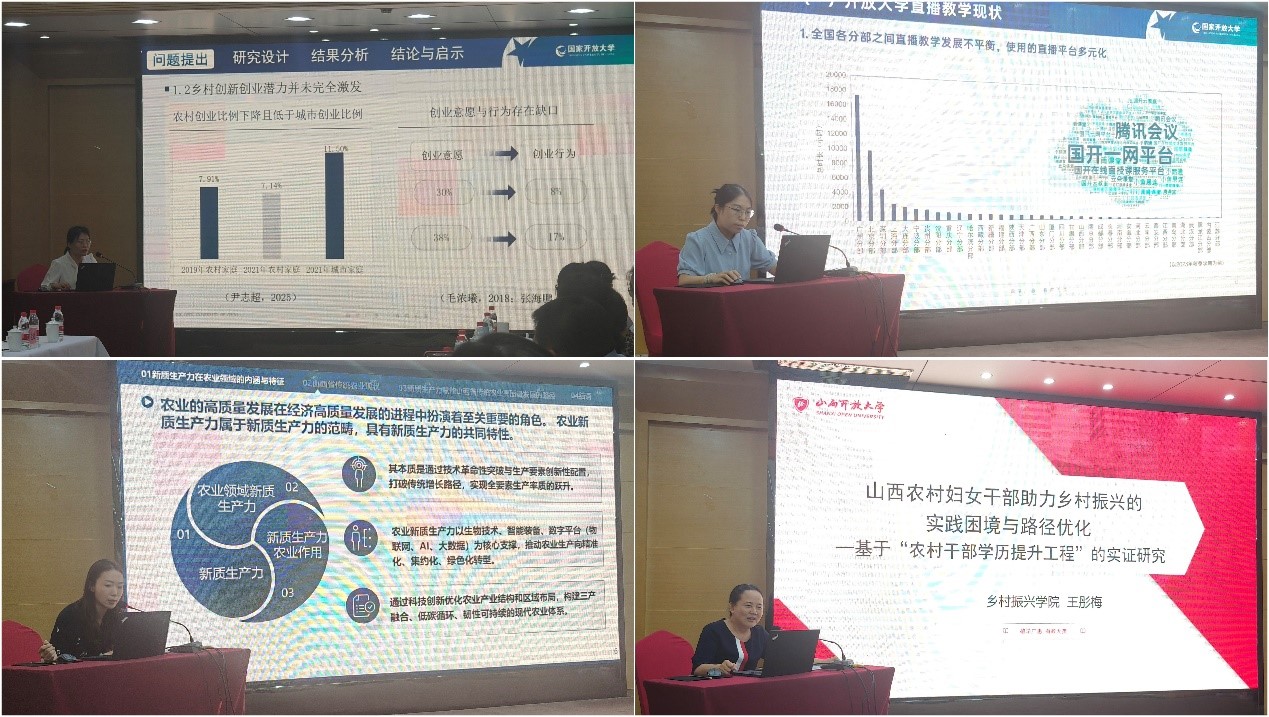 国家开放大学青年教师孟召娣、王真,山西开放大学中青年教师龚泽华、王彤梅分别以《福格行为模型视角下农民创业行为决策研究》《开放大学责任教师直播教学投入与学生需求的对比分析》《新质生产力赋能山西省传统农业高质量发展的路径研究》《山西农村妇女干部助力乡村振兴的实践困境与路径优化——基于“农村干部学历提升工程”的实证研究》为题开展学术分享。