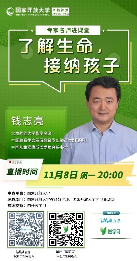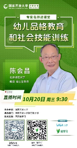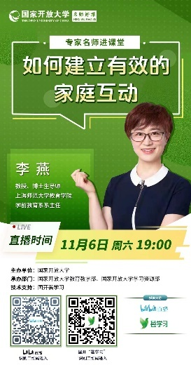 “家庭是人生的第一个课堂,父母是孩子的第一任老师”习近平总书记作为党和国家的最高领导人,在他的治国理政思想与实践之中对家庭及家庭教育的重要作用予以了高度的关注。为了深入贯彻学习习近平总书记的重要思想,落实立德树人根本任务,为学前教育专业学生开拓视野,将最优质的课程资源送到学前教育第一线,2021年10月20日到11月8日,国家开放大学教育教学部联合学习资源部特别策划了名师好课系列之“学前教育专家名师进课堂”家庭教育系列公益直播课。活动特别邀请了全国家庭教育研究领域的四位顶级专家:北京师范大学陈会昌教授、首都师范大学康丽颖教授、上海师范大学李燕教授和北京师范大学钱志亮教授。