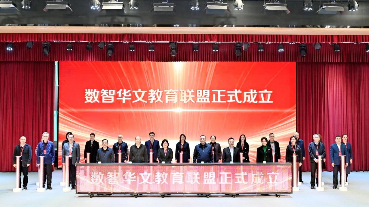 开幕式现场,20余位嘉宾共同开启“数智华文教育联盟”成立仪式。联盟旨在构建由开放大学体系、普通高校、国内外合作机构组成的数智化华文教育网络,促进各单位教师间的交流互鉴,提升跨学科、跨文化教学能力。