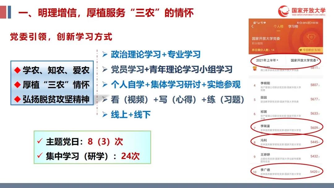 国家开放大学党委扎实开展党史学习教育,以伟大建党精神引领全校各支部和党员干部践行初心、担当使命,自觉为实施乡村振兴战略服务。农林医药教学部党支部在国家开放大学党委的统一部署下,深入学习习近平总书记关于教育、扶贫、“三农”工作的重要论述,创新学习方式,政治理论学习与专业学习相结合,个人自学、集体学习研讨、实地参观相结合,看(视频)、写(心得)、练(习题)相结合,线上与线下相结合,引导党员群众学农、知农、爱农,厚植“三农”情怀,大力弘扬并赓续脱贫攻坚精神。