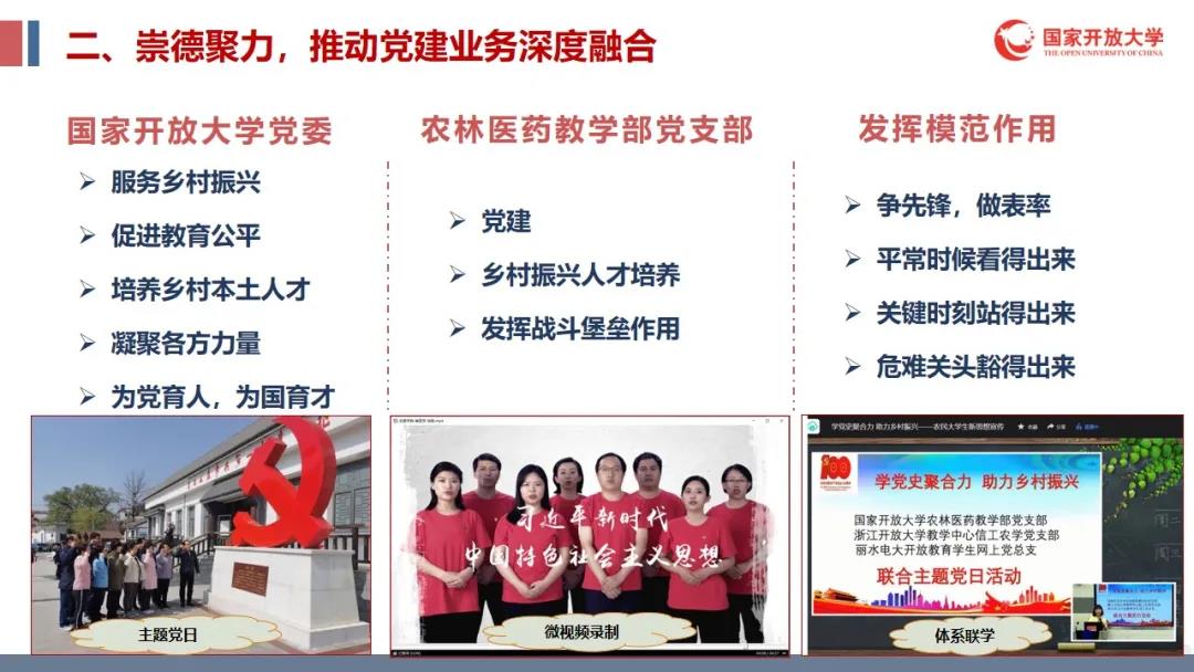 习近平总书记强调,乡村振兴,人才是关键。农林医药教学部党支部紧紧围绕乡村振兴人才培养的中心,落实党政同责,深入推进党建工作与业务工作同谋划、同部署、同推进、同落实。“一村一名大学生计划”坚持“扶贫先扶智,扶贫必扶智”,积极推进教育教学改革,累计为新农村建设和乡村振兴就地培养专、本科农民大学毕业生近60万人。2020年“粮·食安全大家谈”等系列公开课,累计观看人数超过320万。“长征带”教育精准扶贫工程等系列扶贫项目累计资助约8900万元,直接受益约6.8万人。相关项目成果两度被评为教育部直属机关“优秀创新工作案例”,并获2020年度终身学习品牌项目、第34届亚洲开放大学协会年会最佳实践奖银奖、联合国教科文组织哈马德·本·伊萨·哈利法国王2020年度教育信息化奖、2021年度国家开放大教学成果特等奖。