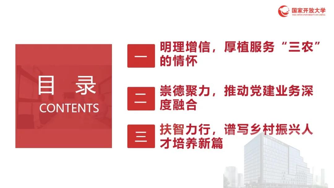 乡村振兴战略是党的十九大提出的一项重大战略,是关系全面建设社会主义现代化国家的全局性、历史性任务,是新时代“三农”工作总抓手。国家开放大学党委深入学习贯彻习近平总书记关于脱贫攻坚、实施乡村振兴战略的重要讲话精神,以高度的政治责任感落实党中央及部党组决策部署,成立乡村振兴学院,组织实施“一村一名大学生计划”、“乡村教师学历提升计划”、“长征带”教育精准扶贫工程等系列项目,推动实现巩固拓展教育脱贫攻坚成果同乡村振兴的有效衔接。农林医药教学部党支部在国家开放大学党委的领导下,坚持党建引领,协同全校相关部门,通力合作、共同助力国家开放大学服务教育脱贫和乡村振兴。2021年6月,党支部被评为教育部直属机关“先进基层党组织”。