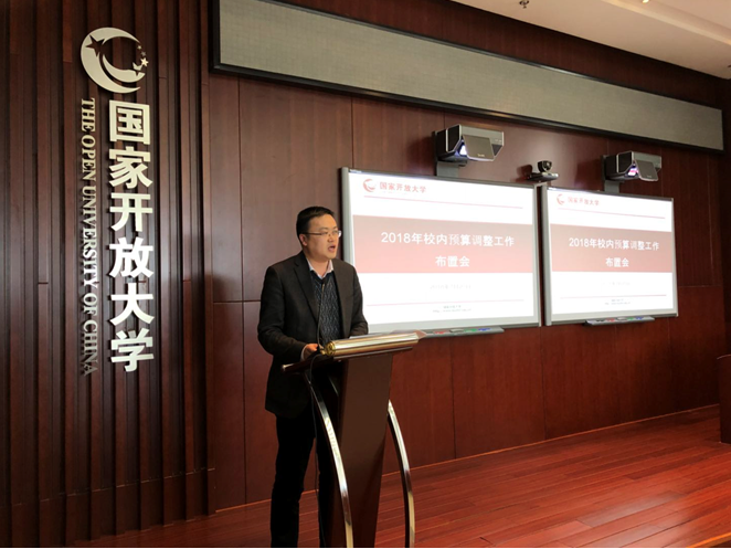 3月21日下午,国家开放大学财务部召开2018年校内预算调整布置会,副校长亓彦伟参加会议并讲话,校内所有部门负责人、办公室主任以及部门预算编报人员等共约60人参加会议,财务部部长张旭红主持会议。