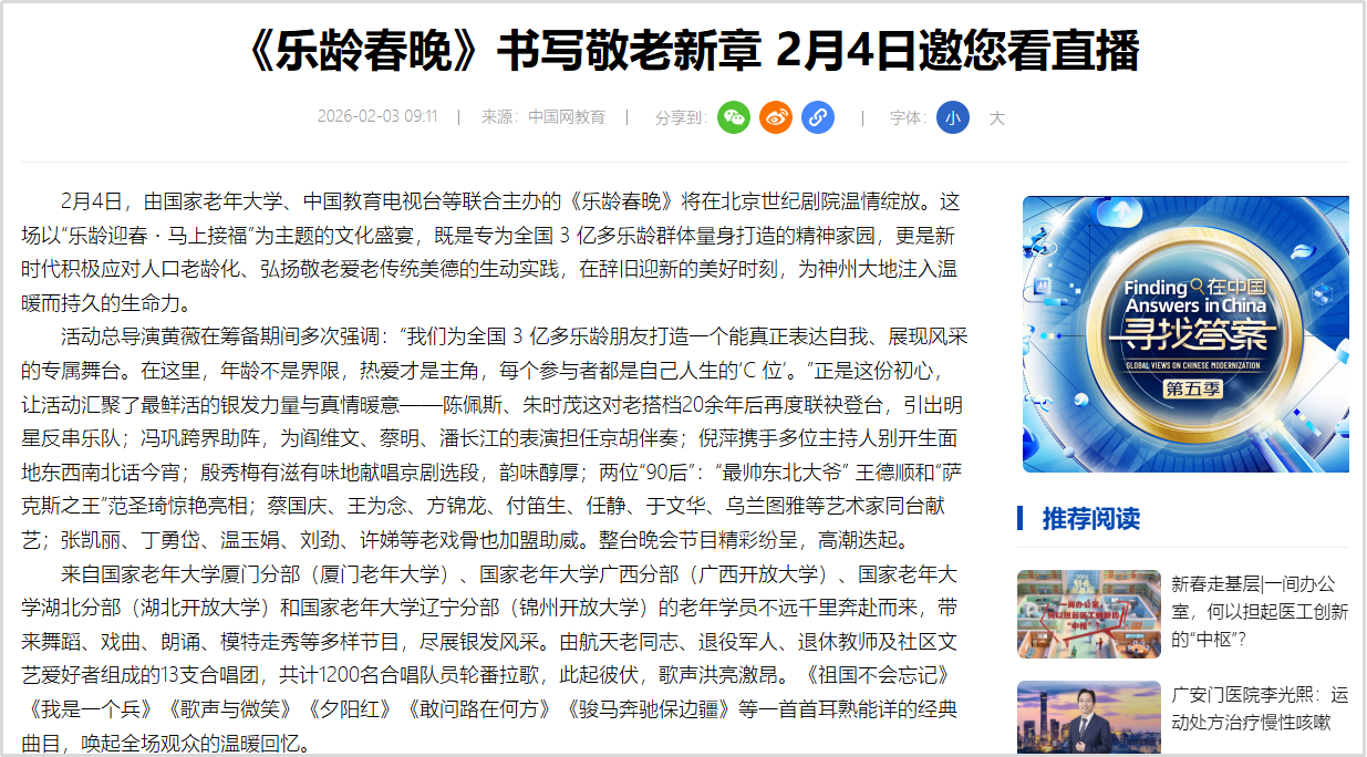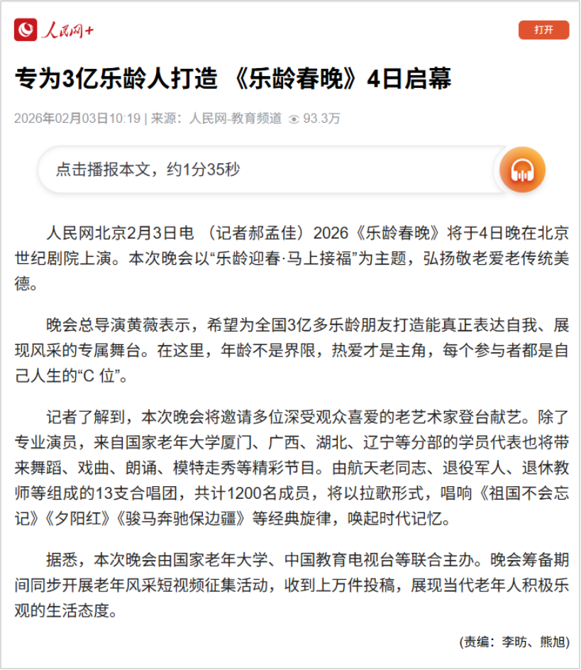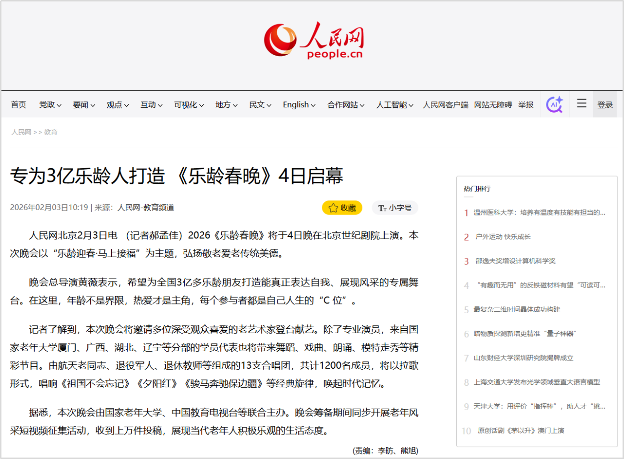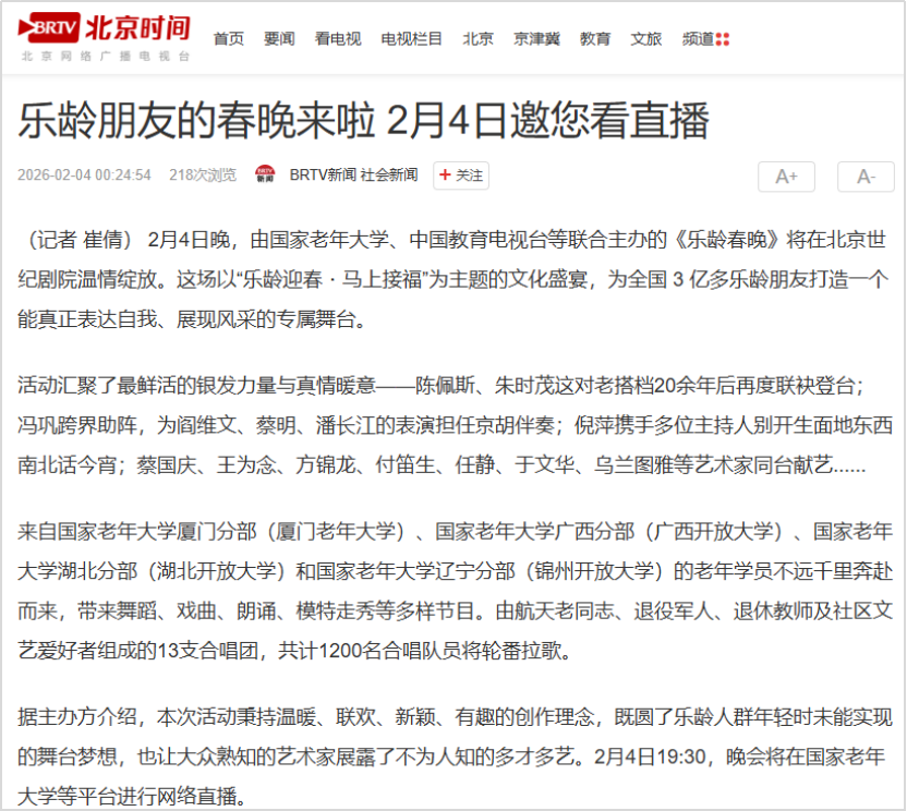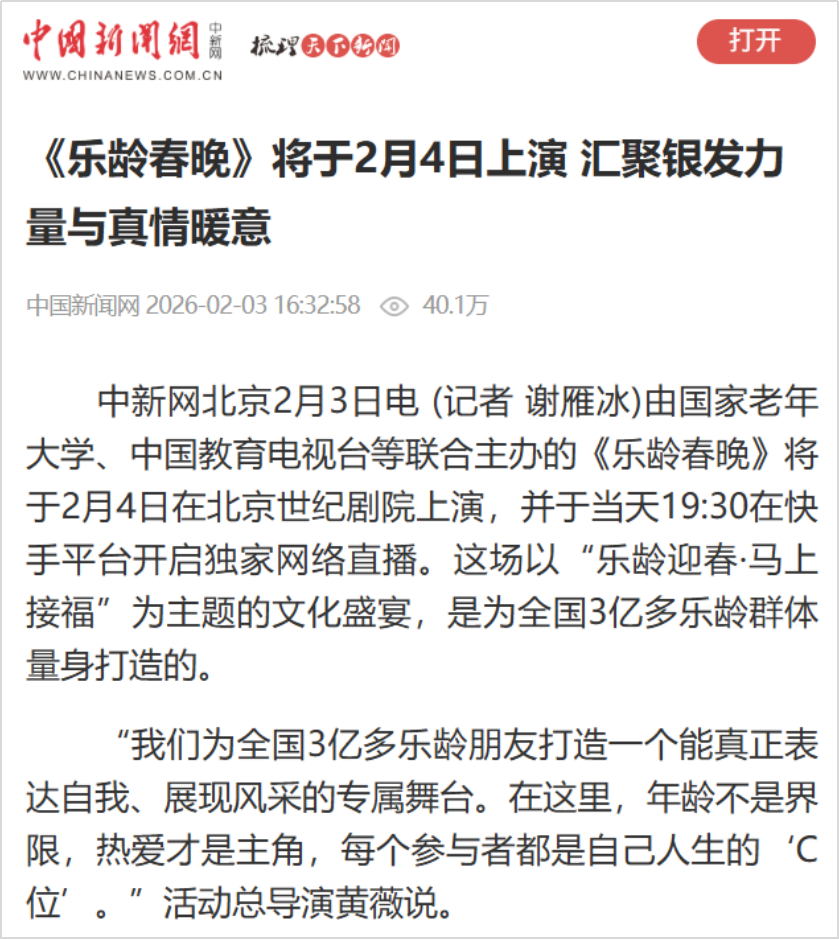 2月4日恰逢立春,春启新程、福伴安康,由国家老年大学、中国教育电视台、北京曜阳公益基金会联合主办,以“乐龄迎春·马上接福”为主题的2026“乐龄春晚”在北京世纪剧院温情绽放。通过打造专属乐龄群体的新春盛宴,彰显新时代“银龄少年”的活力与风采。