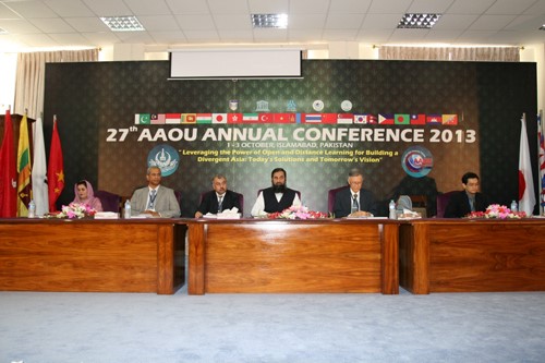 2013年10月1日至3日,第27届年会在巴基斯坦首都伊斯兰堡召开,国家开放大学原党委副书记张辉率代表团一行5人出席。此次年会由巴基斯坦阿拉玛•伊克巴尔开放大学(AIOU)承办,主题为:“增强远程开放教育力量,建设多样化亚洲——当前方案和未来愿景”。在AAOU全体委员会会议上,中国国家开放大学当选为2014-2016届AAOU执委会成员。会议期间,巴基斯坦教育部部长、阿拉玛•伊克巴尔开放大学名誉副校长Baleeghur Rehman同张辉副书记进行了会面,希望两所开放大学未来能够开展多领域、多层次合作。