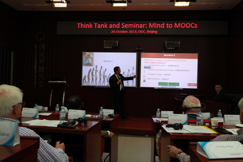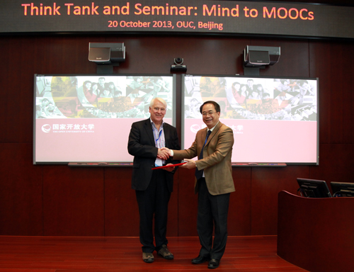 2013年10月20日,由国家开放大学承办的ICDE“大规模开放式在线课程的思考(Mind to MOOCs)”智库研讨会在北京举行。作为ICDE第25届世界大会的延续,此次研讨会上ICDE执委会成员及相关国际会议代表就“大规模开放式在线课程”展开了讨论。联合国教科文组织开放教育资源事务主席及开放教育协调员Fred Mulder、欧洲电子学习质量基金会主席及MOOCs质量项目代表Ulf-Daniel Ehlers、欧洲远程电子学习网络协会副主席Alan Bruce等就MOOCs在世界不同地区的现状、重要性、影响力以及如何在高等教育中利用MOOCs等作主题发言。国家开放大学党委副书记张少刚作了题为《MOOCs:开放大学怎么做?》的主题报告。研讨结束后,国家开放大学聘请ICDE执委、英国开放大学教授Alan Tait为数字化学习技术集成与应用工程研究中心高级顾问,校长杨志坚向Alan Tait教授颁发了聘书。