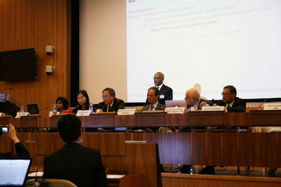 2015年6月9日-11日,由ICDE和联合国教科文组织(UNESCO)联合组织的“全球高端政策论坛:在线、开放和灵活的高等教育”在巴黎UNESCO总部举行,共有来自全球57个国家、地区和国际组织的近200名代表出席该论坛,与会代表紧紧围绕“公平、机会和高质量的学习成果”主题展开了讨论。国家开放大学校长杨志坚应邀在论坛上发言,分享了我校基于信息技术推动教育公平的实践。