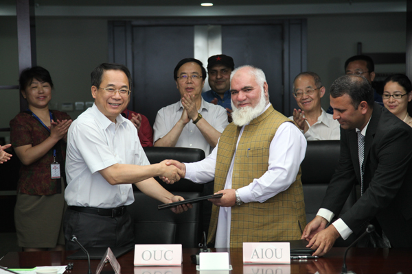 2014年6月9日,AIOU校长Ali Asghar Chishti教授一行3人来访国家开放大学。双方就汉语教学、国际合作项目、工程研究中心3D打印以及人才交流项目等进行了协商,拟本着平等互敬、资源共享、互惠互利、共同发展的原则,在汉语教学、合作研究、期刊和学术作品交流等多方面开展合作。国家开放大学校长杨志坚与阿拉玛·伊克巴尔开放大学校长Ali Asghar Chishti代表双方签署了合作协议。