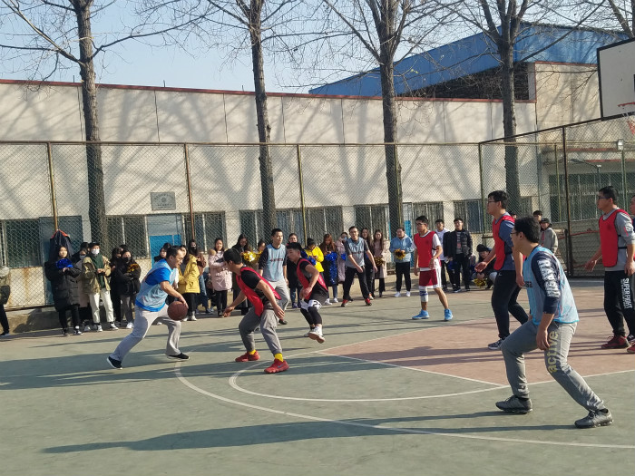 随着裁判的一声哨响,比赛正式开始。上半场一开场参赛教师与学生就迅速进入状态,学生队通过积极的拼抢,打防守反击,并利用个人能力突破,不断取分。教师队则稳扎稳打,利用娴熟的球技、默契的配合和精准的投篮,不落其后。虽然初冬的天气有些寒冷,却抵挡不住球场上队员们的热情。