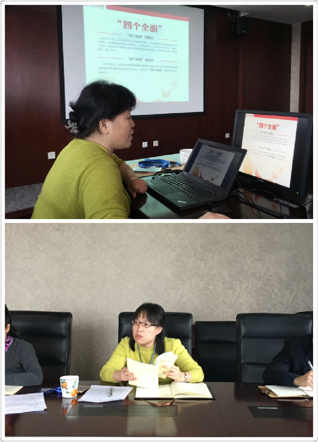 熊应进老师带领大家学习《党中央有关四个全面战略布局》和《党中央有关五大发展理念》两个主题文件。她结合下发的文件材料,首先介绍了党中央提出四个全面战略布局的内涵、发展历程、逻辑关系、价值意义。她指出,全面建成小康社会、全面深化改革、全面依法治国、全面从严治党是新一届中央领导集体治国理政的总体框架,使当前和今后一个时期,党和国家各项工作关键环节、重点领域、主攻方向更加清晰,内在逻辑更加严密,对推动改革开放和社会主义现代化建设迈上新台阶提供了强力保障。随后,她带领大家学习党中央有关五大发展理念的内涵、路径、行动部署,指出创新、协调、绿色、开放、共享的五大理念是引领中国十三五时期发展全局的五大发展理念,分别有着丰富的内涵,侧重点和主要任务,五大发展理念之间的关系也是相互联动、相辅相成的,需要用整体的观念去学习和把握。在每个理念的解读过程中,她详细指出了理念要解决的重点问题,并与开放大学的实际工作相结合,谈论了自己的看法。