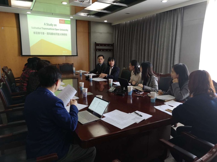 王迎首先对泰方的来访表示热烈欢迎,对STOU参与和支持《丛书》工作给予高度评价,并向泰方介绍了研究院及国际比较研究的概况。出版社介绍了《丛书》在国内的出版发行情况。李薇作为STOU项目负责人就书稿编写工作安排和进度做了说明。双方作者就STOU书稿部分章节的写作问题进行了细致探讨。