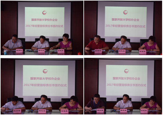 杨志坚校长代表主管单位会同资产管理公司总经理孙艳萍,分别与出版社、音像社、培训中心、国开贝和等公司负责人签署2017年经营目标责任书。