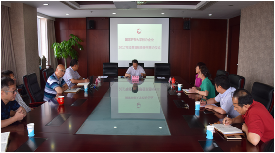 2017年6月12日,国家开放大学校办企业2017年经营目标责任书签约仪式在五棵松办公楼1204会议室隆重举行。学校领导对本次签约工作给予了高度重视,校长、校国资委主任杨志坚,副书记、校国资委副主任杨孝堂出席会议,见证了各校办企业2017年经营目标责任书的签订。