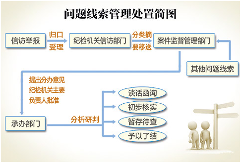 线索处置——指纪检机关对问题线索进行综合分析,按照谈话函询、初步核实、暂存待查、予以了结等方式进行处置。