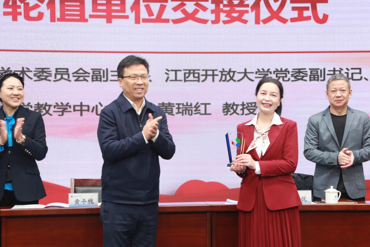 第四届分委会继承了上届分委会的优良传统,委员佩戴分委会徽章,主任委员、江西开放大学党委副书记、校长黄平槐为轮值单位委员黄瑞红教授颁发轮值手执,象征着分委会工作的有序传承与持续推进。黄平槐表示,文史哲艺分委会对标国家开放大学学术委员会的宗旨,建立了委员单位轮值机制,与分部学术委员会对接机制和与校学位委员会及相关学院的联动机制,力求服务总部,面向体系,协调发展。