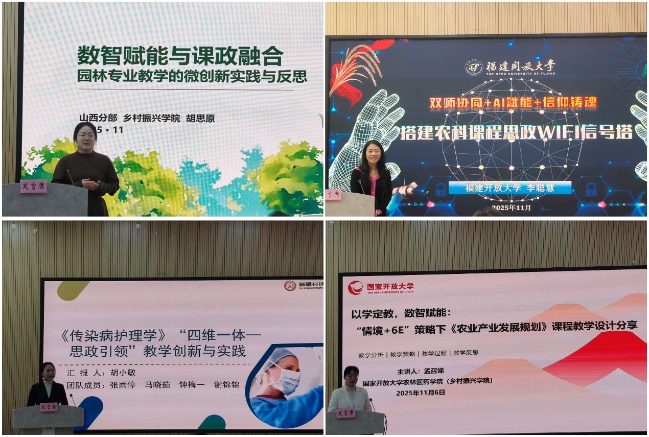 来自山西分部、福建分部、新疆分部、总部的青年教师胡思原、李聪慧、胡小敏、孟召娣分别以《数智赋能与课政融合:园林专业教学的微创新实践与反思》《双师协同+AI赋能+信仰铸魂——搭建农科课程思政WIFI信号塔》《<传染病护理学>“四维一体—思政引领”教学创新与实践》《以学定教,数智赋能:“情境+6E”策略下<农业产业发展规划>课程教学设计分享》为题作教学创新分享。