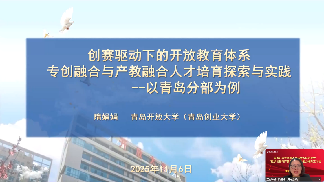 活动特邀青岛开放大学(青岛创业大学)创业教育学院隋娟娟院长以线上线下相结合的方式作《创赛驱动下的开放教育体系专创融合与产教融合人才培育探索与实践——以青岛分部为例》的专题报告。报告结合中国国际大学生创新大赛典型案例,深入剖析了创赛驱动模式下的创新创业教育实践路径、专创融合与产教融合人才培养模式创新等内容。
