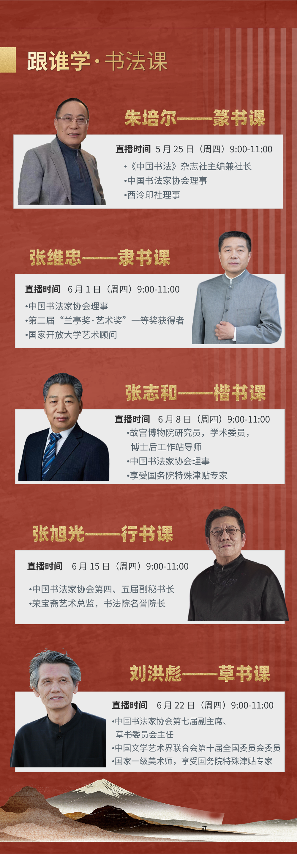 “艺术名家课”是国家开放大学深入贯彻落实党的二十大精神的具体实践,是落实学生核心素养塑造工程的重要内容。通过组织学习线上课程,开展学习故事、学习体会征集,评选优秀美育学习中心,开展线上线下结合展示交流活动等方式,全面提升国家开放大学学生的文化素质和艺术修养。国开艺术学院特邀吴悦石、郭石夫、陈克永、何加林、范存刚五位著名国画家,刘洪彪、张旭光、张志和、朱培尔、张维忠5位著名书法家,精心打造10门高品质网络课程。内容包括花鸟画、山水画,以及篆、隶、楷、行、草5种书体,以“一书一帖、一画一作”为主题,围绕历史经典书画名作,讲授基础书画艺术理论、解析作品艺术风格与临摹方法,激发学习者的学习兴趣,引导学习者进入书画艺术学习的大门。